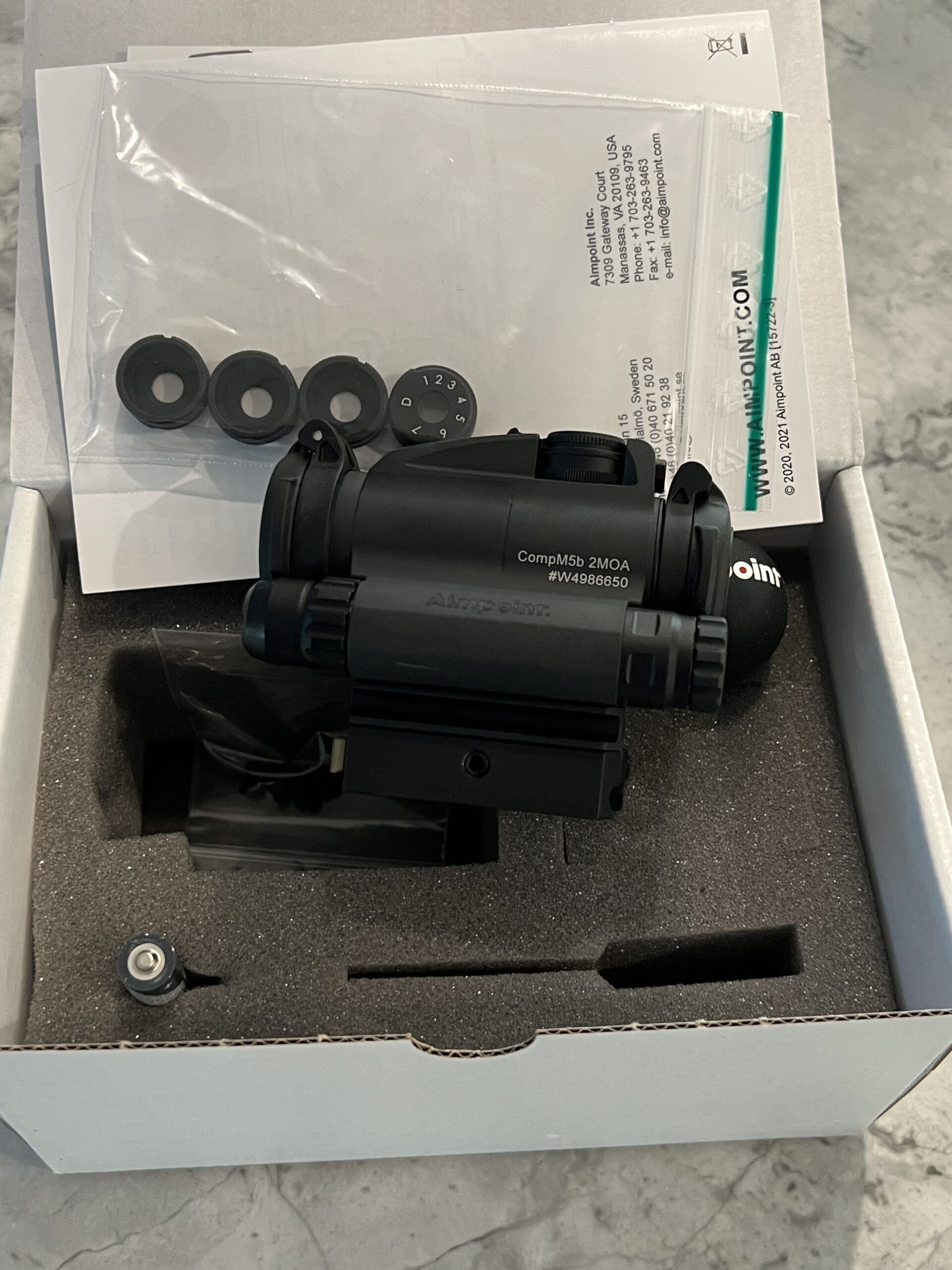 INCLUDES: LRP Mount, Spacer, Flip-Up Lens Covers, 4 pcs Fixed Turrets, Custom Turret, Wind Turret, AAA Battery, Aimpoint® Tool, and Drill Tool