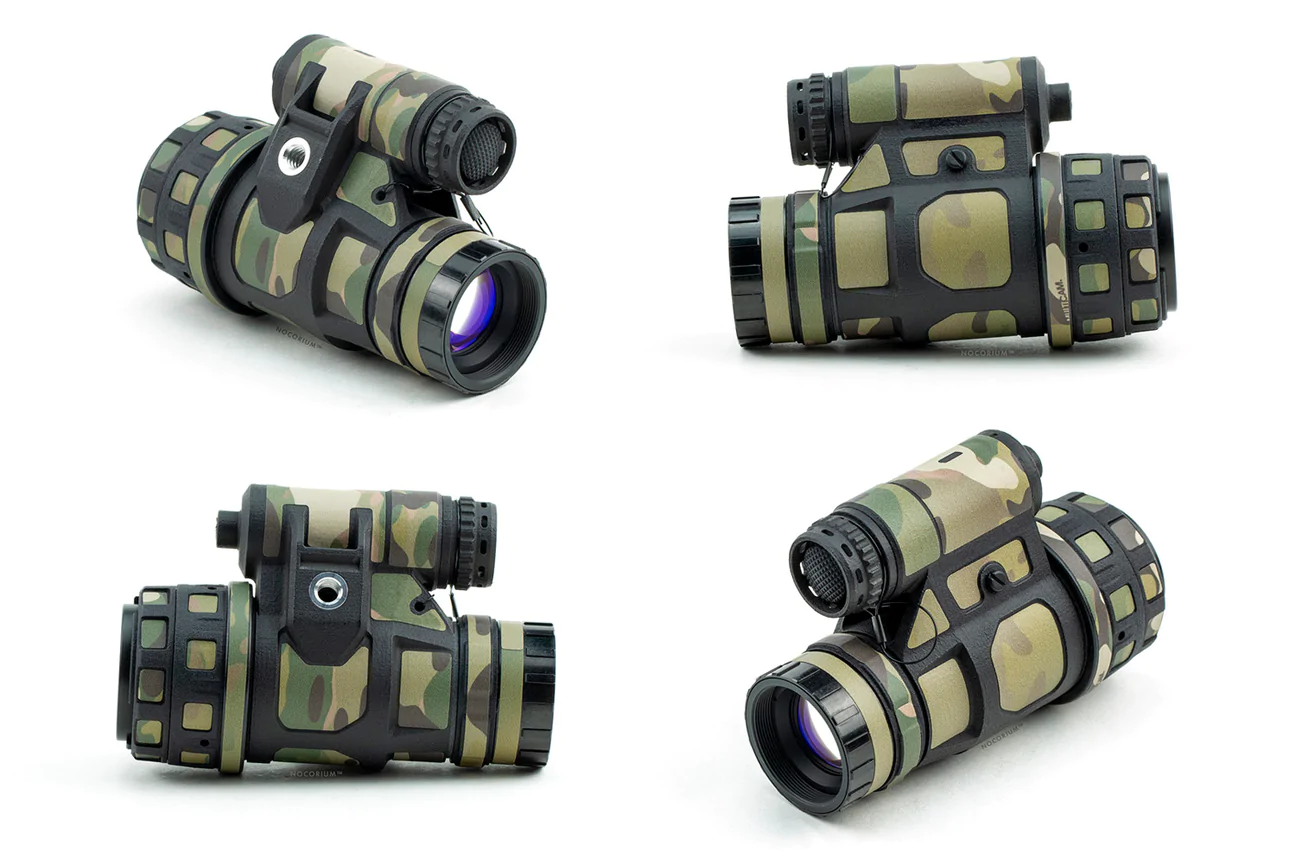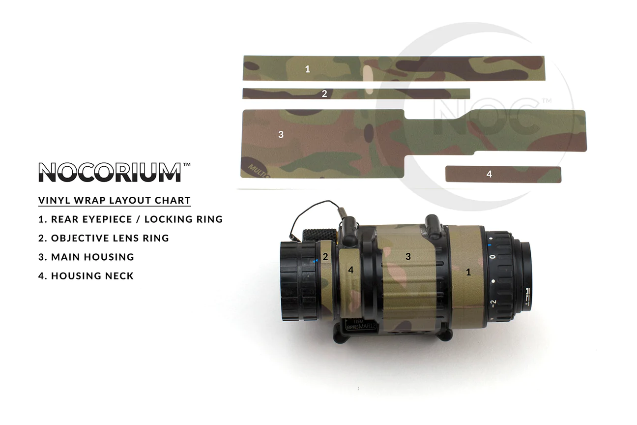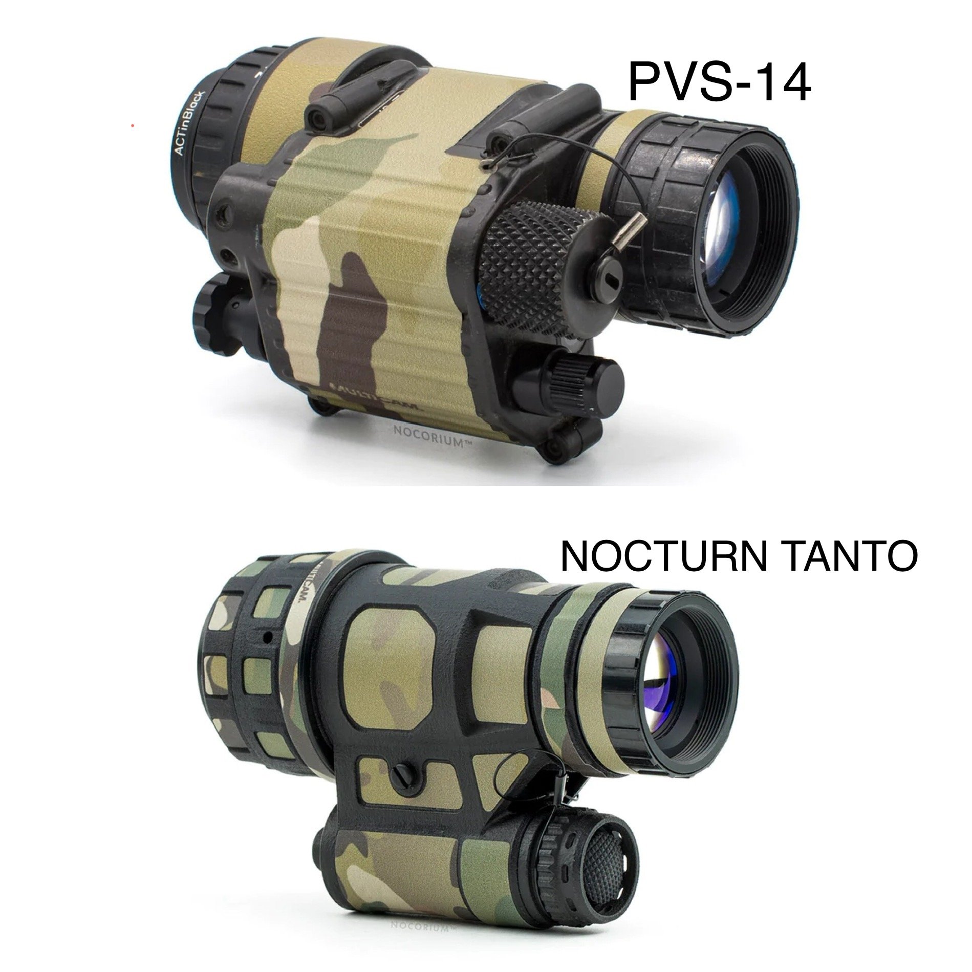 Nocorium™ is a non-permanent, automotive grade adhesive-backed vinyl wrap carefully designed and precision cut to customize the appearance of your Night Vision Monocular – PVS-14 or Tanto are essentially a second skin that provides an additional layer of protection from minor scuffs and scratches, while also allowing the device to better blend-in to your surroundings.