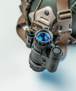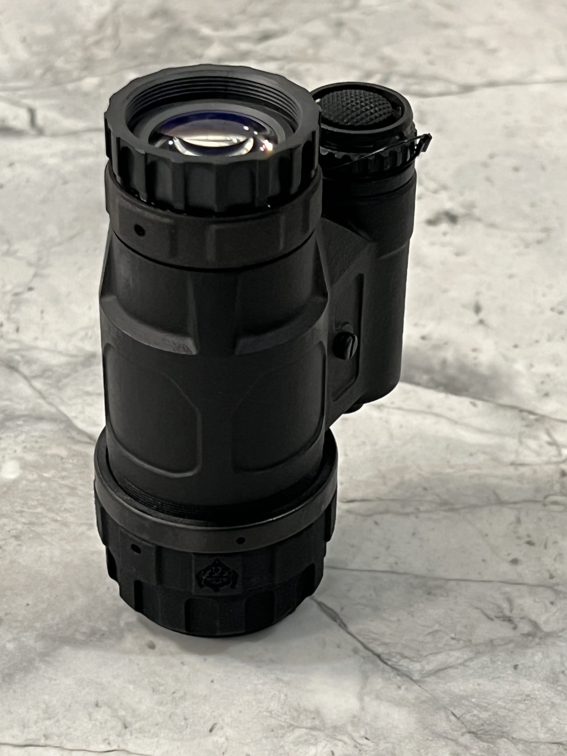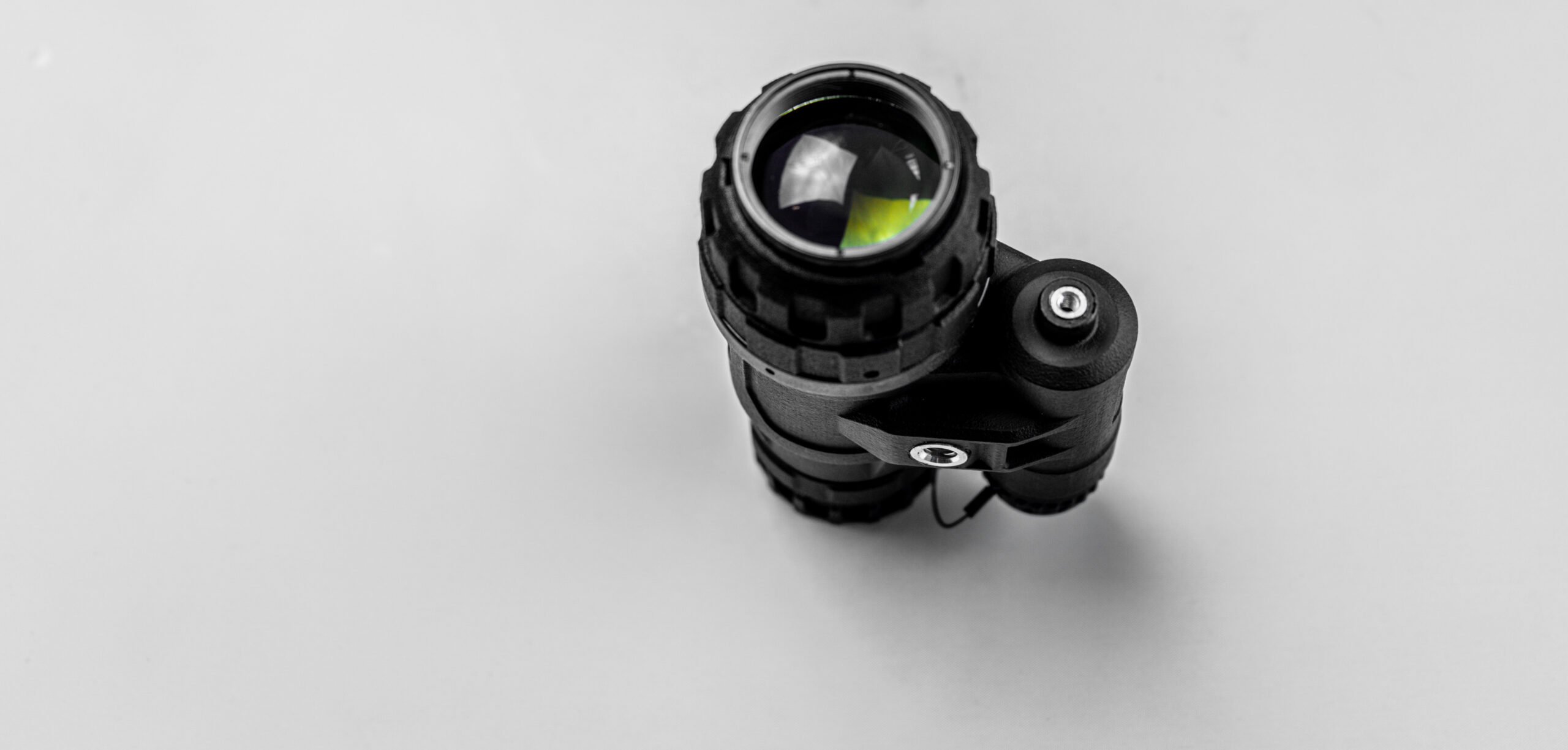 It is simple with a minimalist lightweight design. Push button on/off in the cap to reduce weight and reduce the footprint of the monocular. When assembled to the TAB “Daisho” bridge extra features are enabled such as articulation to the side for single or dual eye use. The articulating design also enables users to operate vehicles without limiting head space by eliminating the need to stow the unit upright or to tuck the pods against the helmet when stowed.