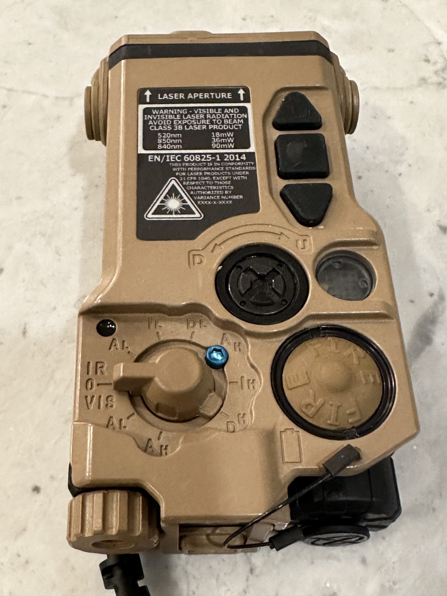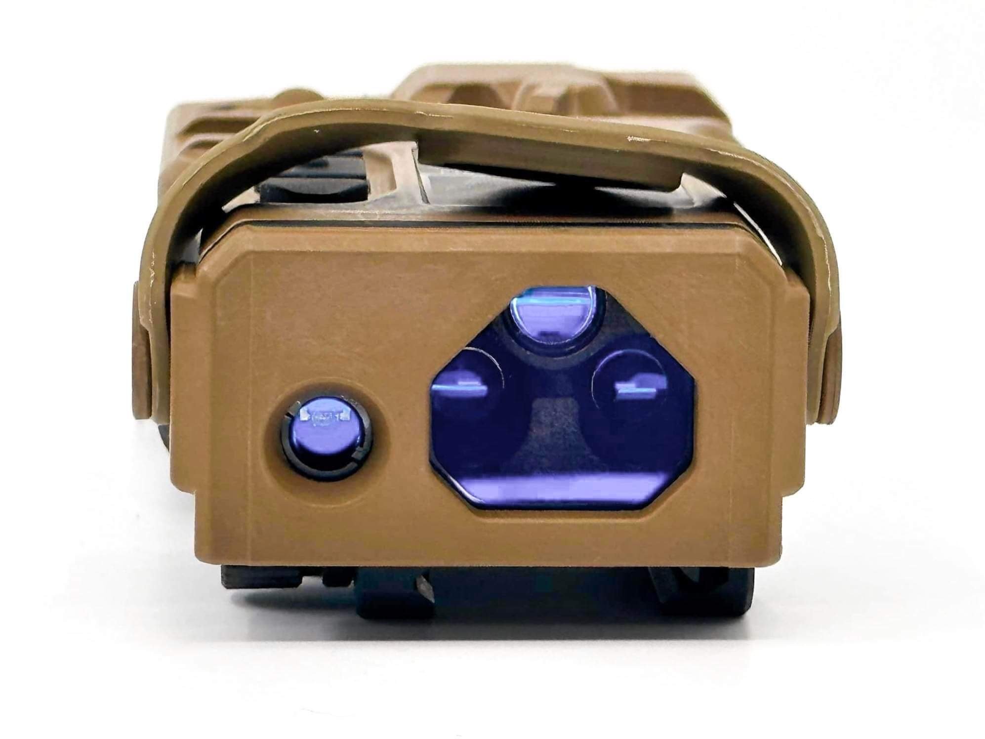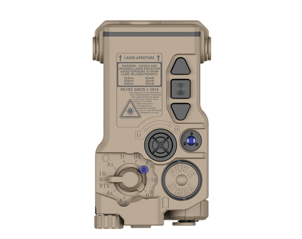 This product is available in either red or green laser configurations. The NIR room illuminator combined with the variable NIR VCSEL illuminator features best in class overall effective tactical solution in any low light combat situation. The ergonomic illuminator spool location allows easy rapid adjustment of the NIR illuminator beam divergence for variable distances and mission requirements.